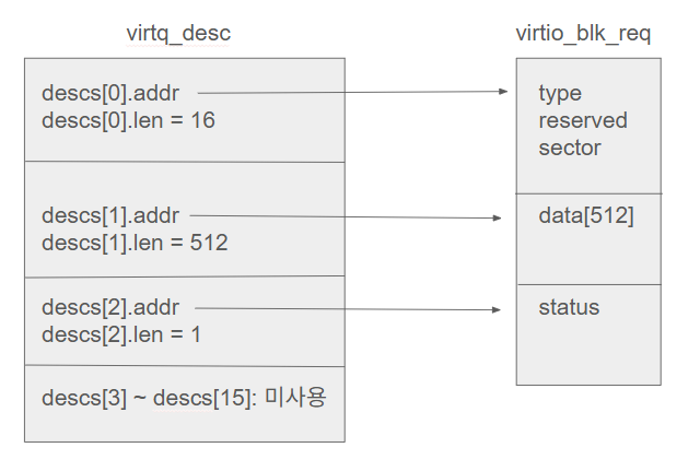요청은 3개의 디스크립터 체인으로 구성된다. virtio_blk_req 구조체의 각 영역을 디스크립터 하나씩에 매핑하는 것이다.